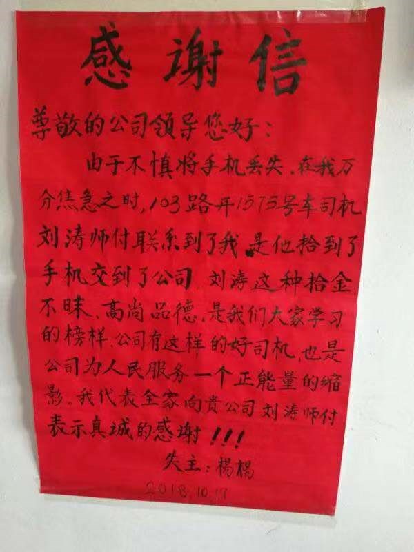 2.10月17日,103路駕駛員劉濤拾到一部OPPO手機,細心的他按照電話里的信息聯(lián)系到了失主,由于失主在公交車上丟了手機,真沒報任何希望,司機拾到手機并主動聯(lián)系失主這一行為,深深的打動了這位叫楊楊的女士,于是她親手寫了一封表揚信交到路隊,她說:劉濤師傅的高尚品德,正是公交人為乘客服務正能量的一個縮影。