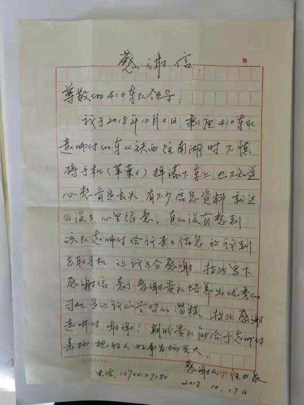 5.2018年10月16日,汪先生乘坐410線2061號駕駛員趙正博師傅車從鐵西往南湖走時,不慎將手機掉到了車里,下車后,汪先生很是著急,因為手機內(nèi)有不少信息,正在焦急中,趙師傅拾到他的手機給他的家人去了信息,并把手機交到410線調(diào)度室,汪先生帶著表揚信來到調(diào)度室,調(diào)度及時把手機還給了失主,汪先生連連感謝,感謝貴公司培養(yǎng)出這樣優(yōu)秀的駕駛員。