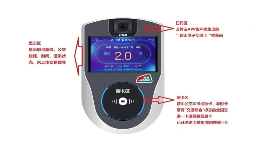 新型“掃碼支付”設備分三個區(qū)域。 上方為掃碼區(qū):支持支付寶客戶端生成的鞍山電子交通卡乘車碼。 中間為顯示區(qū):可顯示刷卡票價、日期、時間、線路信息、站點信息、通信情況等信息。 下方為刷卡區(qū):支持鞍山公交IC卡標準卡、異形卡、帶有“交通聯合”標志的全國交通一卡通互聯互通卡以及已開通刷卡乘車功能的銀行卡。 用戶現階段需擁有一部可安裝支付寶的智能手機。 方式一 四步操作、掃碼出行: 第一步 下載并安裝支付寶APP客戶端; 第二步 打開APP進行實名登記和認證; 第三步 在支付寶首頁,打開“掃一掃”,掃下面二維碼